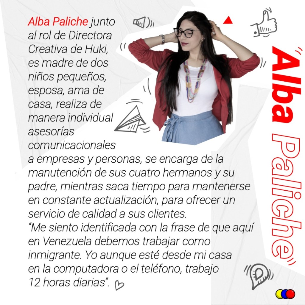 Alba Paliche junto al rol de Directora Creativa de Huki, es madre de dos niños pequeños, esposa, ama de casa, realiza de manera individual asesorías comunicacionales a empresas y personas, se encarga de la manutención de sus cuatro hermanos y su padre, mientras saca tiempo para mantenerse en constante actualización, para ofrecer un servicio de calidad a sus clientes. “Me siento identificada con la frase de que aquí en Venezuela debemos trabajar como inmigrante. Yo aunque esté desde mi casa en la computadora o el teléfono, trabajo 12 horas diarias”.