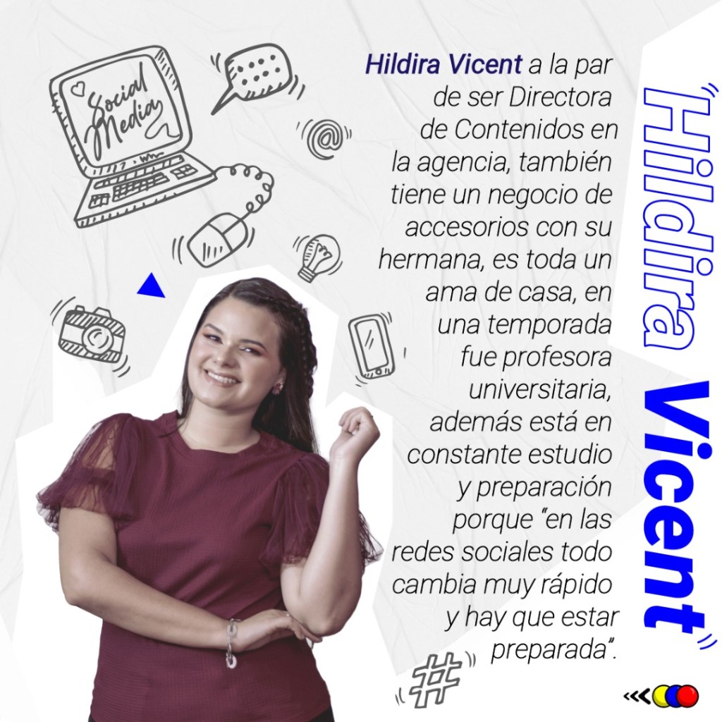 Hildira Vicent a la par de ser Directora de Contenidos en la agencia, también tiene un negocio de accesorios con su hermana, es toda un ama de casa, en una temporada fue profesora universitaria, además está en constante estudio y preparación porque “en las redes sociales todo cambia muy rápido y hay que estar preparada”.
