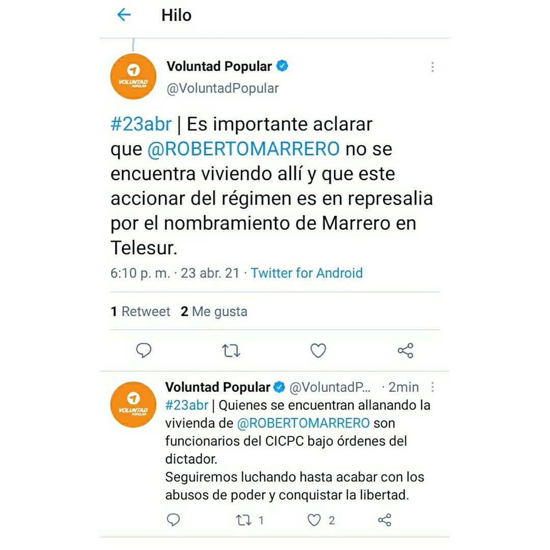 A través de su cuenta en Twitter, el exdirector del despacho de Juan Guaidó, Roberto Marrero denunció que funcionarios del CICPC intentaron allanar su casa en Las Mercedes este viernes 23 de abril.