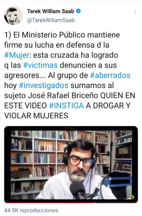 Prosiguió que al grupo de personas que ya están siendo investigadas, sumaron a José Rafael Briceño, «Quien en este video instiga a drogar y violar mujeres», escribió el fiscal.