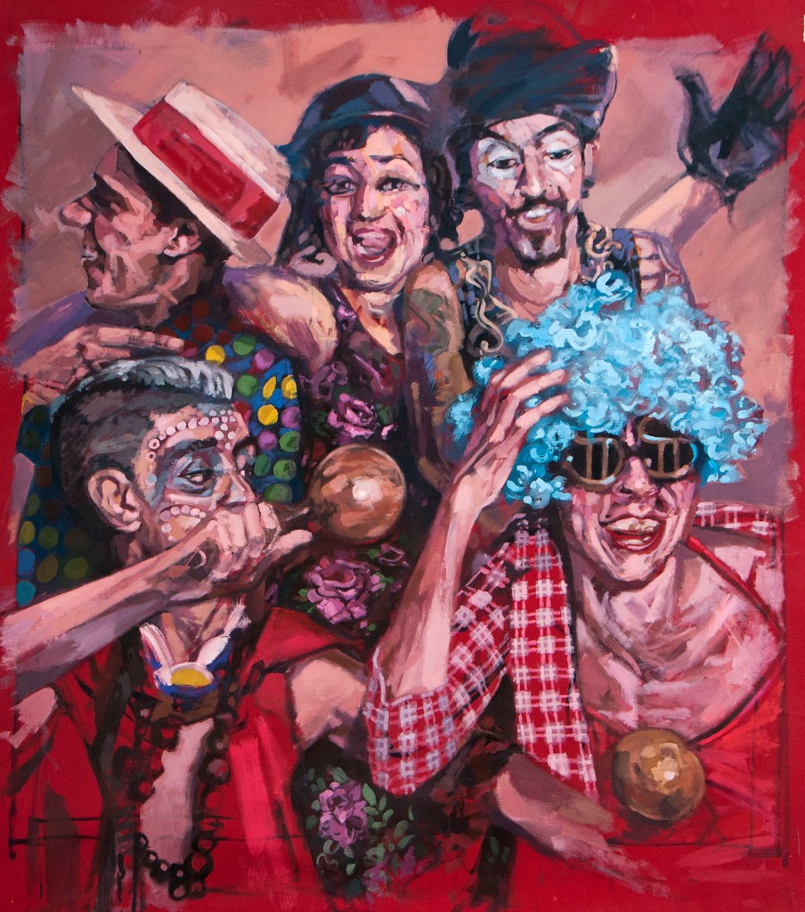 El costarricense Carlos Poveda exhibe sus particulares bodegones gastronómicos en la exposición. En esta ocasión, sus esculturas son servidas en tres platos. Del placer de la comida se pasa al de la fiesta, al menos temáticamente, con las pinturas del barquisimetano Ramón Pimentel, quien plasma en sus lienzos escenas y retratos que remiten a la celebración del encuentro con el otro.
