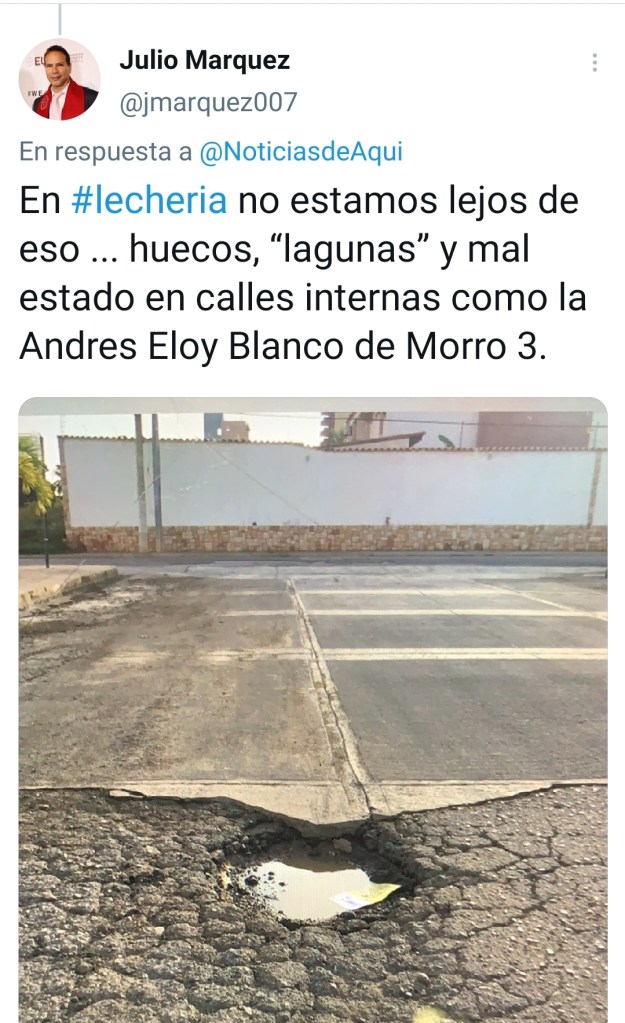 «Huecos, lagunas y mal estado de las vías internas en Lechería», denuncia Julio Márquez.