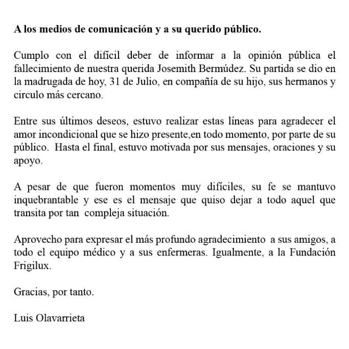 Luego de luchar incansablemente contra el cáncer, la animadora y actriz venezolana Josemith Bermúdez falleció en la madrugada de este sábado 31 de julio rodeada de su hijo y familiares.
