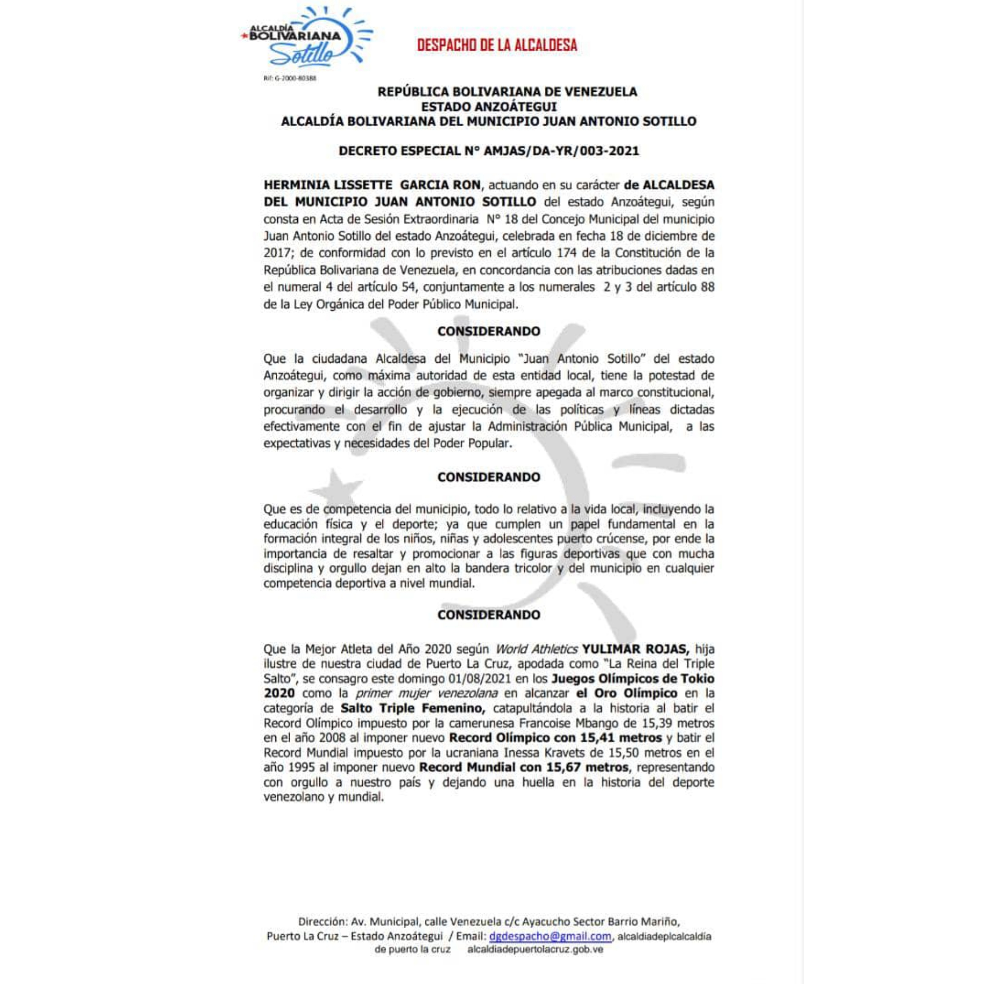 El decreto especial N° AMJS/DA-YR/003-2021, reza: “Se declara como Día de Júbilo no laborable el día lunes 02 de agosto de año en curso, en celebración a nuestra campeona olímpica y poseedora del nuevo récord olímpico y mundial en la categoría de Salto Triple Femenino, la atleta puerto crucence Yulimar Rojas ”.