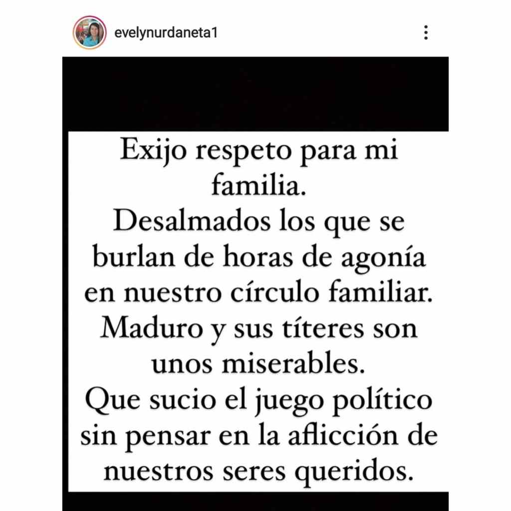 Dijo @evelynurdaneta1 «Desalmados los que se burlan de horas de agonía en nuestro círculo familiar. Maduro y sus títeres son unos miserables. Que sucio el juego político sin pensar en la aflicción de nuestros seres queridos» .