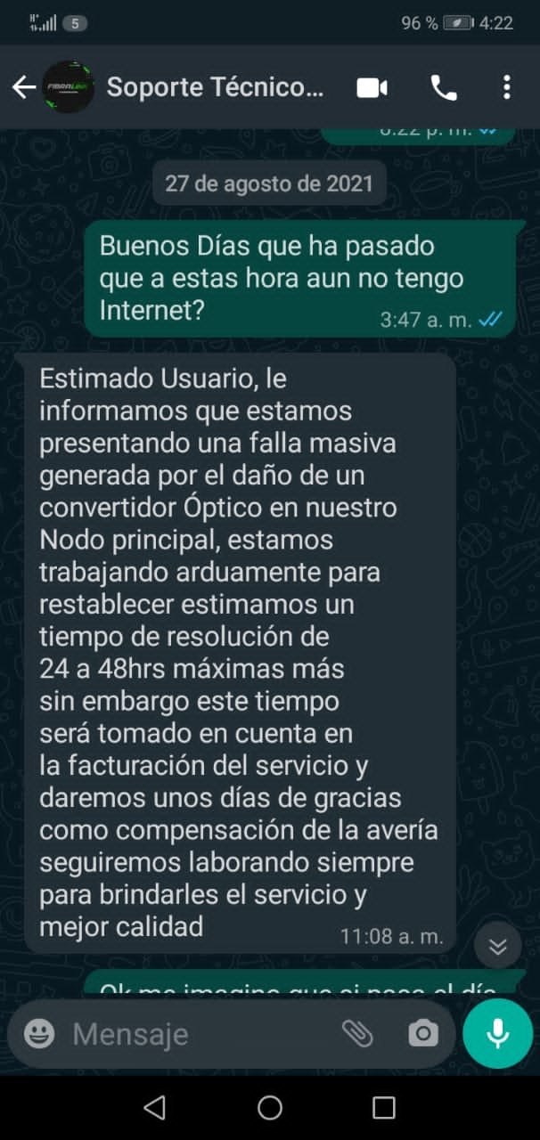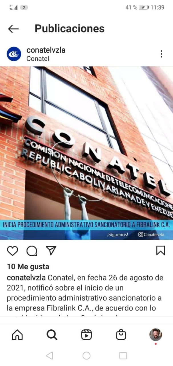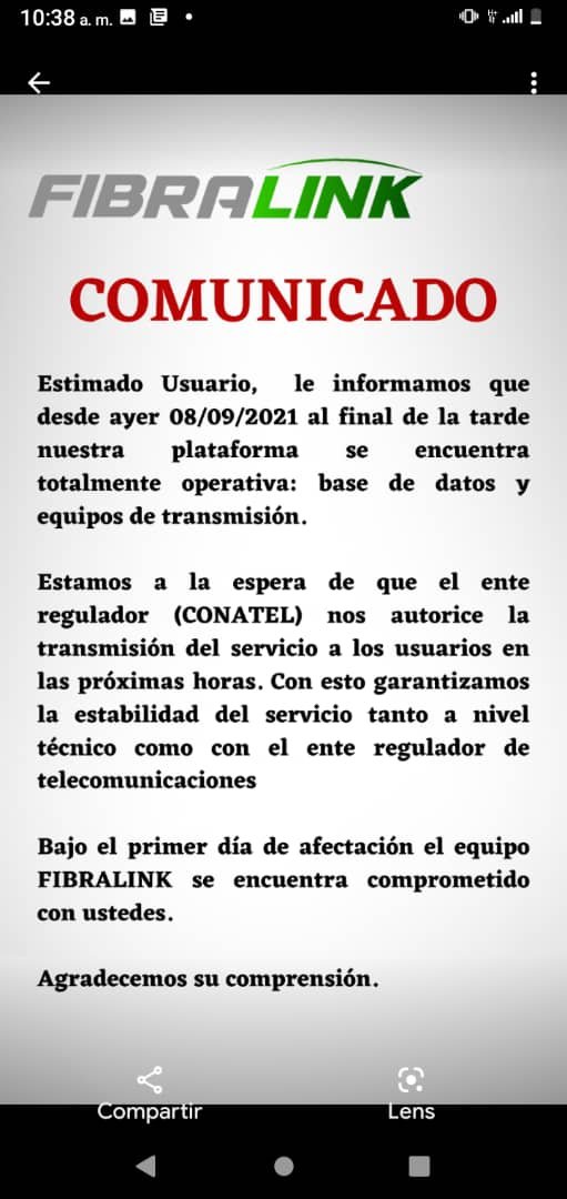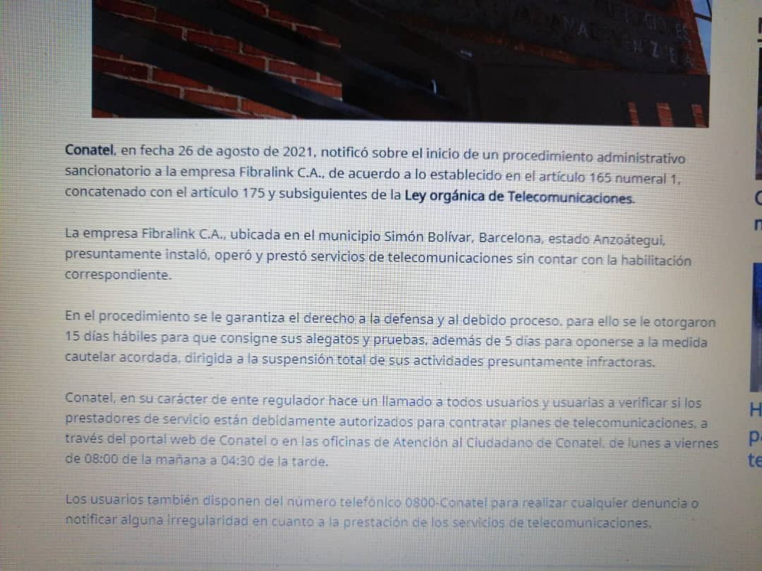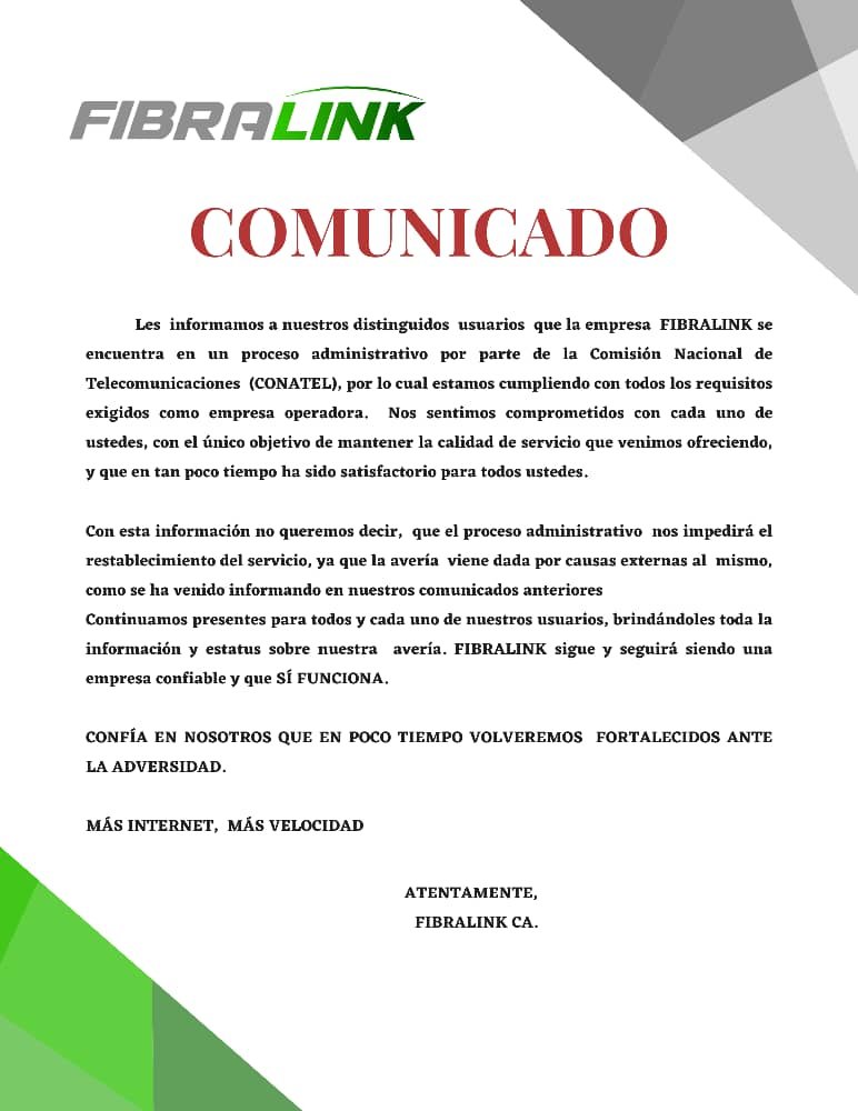 Si le explico soy un suscriptor de la Empresa Fibralink desde el 17 Mayo del presente año y venía disfrutando el servicio de 70 Mb mensuales por 40$ pero el día 26 de Agosto del Presente año el Ministerio de Telecomunicaciones (CONATEL) Sanciona a la Empresa *FIBRALINK C.A* rif: *J-500735090* en donde informa desde la Página Web Oficial que la Misma fue sancionada según los establecidos en el Art 165 Número 1 de la Ley de Telecomunicaciones. En un principio ellos informaron a los suscriptores que la falla del Internet se debía a una falla de un convertidor escondiendo el asunto de que *CONATEL* los había sancionado al verse descubierto procedieron a a informar que las sanciones por el ministerio no eran motivo a que nosotros como suscriptores dejemos de percibir la señal de Internet y aunando que el contrato de Fibralink establece que debemos pagar los 5 primeros días del mes y Yo como suscriptor desde que comencé a recibir el servicio he pagado puntual durante 4 meses la cantidad de 40$ mensuales. Por otro lado el departamento de Administración quien lo atiende la Señora *Yohana Arocha* bajo el número de Teléfono *+58 412-1812252* lo único que le ha dicho desde que dejé de percibir el servicio de Internet que espera respuesta de la Gerencia osea el Señor *Arturo Ramos* quien percibe como Director de la Empresa no da ninguna respuesta. Por otro lado la Señorita *Nohelia Jiménez* quien se encarga de la Sala Técnica cuando uno llama no le contesta las llamadas y cuando contesta se escucha su voz expresando lo siguiente *»Ahí esta la ladilla esta, yo no le voy atender, porque ya no hayo que decir»* Cosa por lo cual es una falta de respeto completamente a uno como suscriptor porque llevo mucho tiempo siendo engañado sin dar respuesta ni nada solamente lo que han sabido decirme desde el 26 de Agosto es que dan un plazo de 24 a 48 horas. Por otro lado el encargado de Soporte Técnico de la Empresa Fibralink cuyo nombre es *Víctor Mujica* se comunica con uno para informarle que en nombre de la Empresa voy a entrar en un listado para la retribución del servicio pero que debo cancelar un monto de *40$* osea que no tan solo es que dejen de suministrarte el servicio y no te den respuesta sino que además de eso aun cuando tu como suscriptor no estas moroso con ellos te mando una información por parte de un trabajador en nombre de la empresa indicándote que si deseo la reactivacion del servicio Internet debo cancelar *40$* y cuando llame para comunicarme con la Señora *Yohana Arocha* no me respondió nada lo que debo presumir que es verdad y que entre la misma empresa están mandando a exigir dinero para que uno como suscriptor pague la sanción de la Empresa Fibralink ante Conatel. Quiero adicionar que Conatel le dio un plazo a *Fibralink* para que que restablezcan la señal y ese plazo se venció el 8 de Septiembre pasado día de la Virgen del Valle en donde la Empresa sancionada envía otro comunicado indicando que para ese día ya todos los suscriptores deberíamos estar disfrutando del Internet cosa que es falso porque desde el día de ayer no atienden las llamadas ni mandan comunicado ni nada. Lo único que han hecho es informar la sra *Yohana Arocha* que esta esperando respuesta de la Gerencia osea de parte del Señor *Arturo Ramos* y que ellos ya tienen Internet en las oficinas pero que eso es cuestión de horas ya llevamos 3 fines de semana seguido con las mismas mentira.