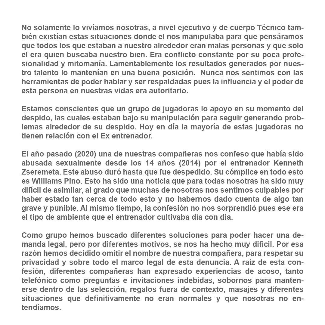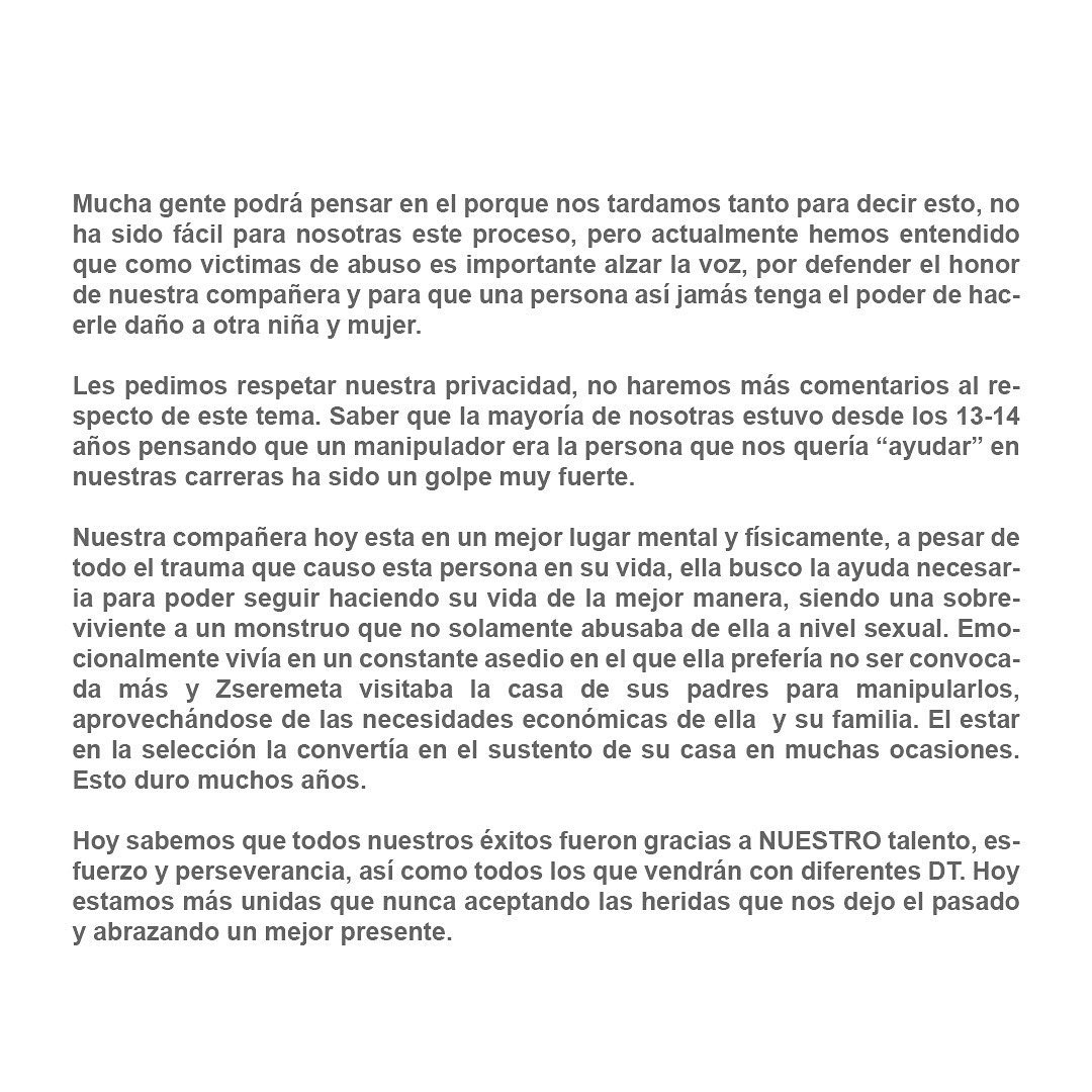 La futbolista venezolana @deynacastellanos publicó un comunicado en nombre de varias de sus compañeras de la selección nacional, en el que denuncian haber sido víctimas de estupro, acoso y abuso sexual por parte de quien fuera su entrenador por varias temporadas, Kenneth Zseremeta.