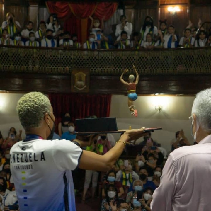 En medio de la ovación y admiración de las personas presentes en el Teatro Cajigal de Barcelona, la atleta @yulimarrojas45 , que se proclamó campeona olímpica del triple salto, batiendo récord del mundo en los Juegos Olímpicos de Tokio 2020, recibió de manos del Gobernador del estado Anzoátegui, Antonio @barretosira , el decreto que incluye su nombre en las efemérides regionales.