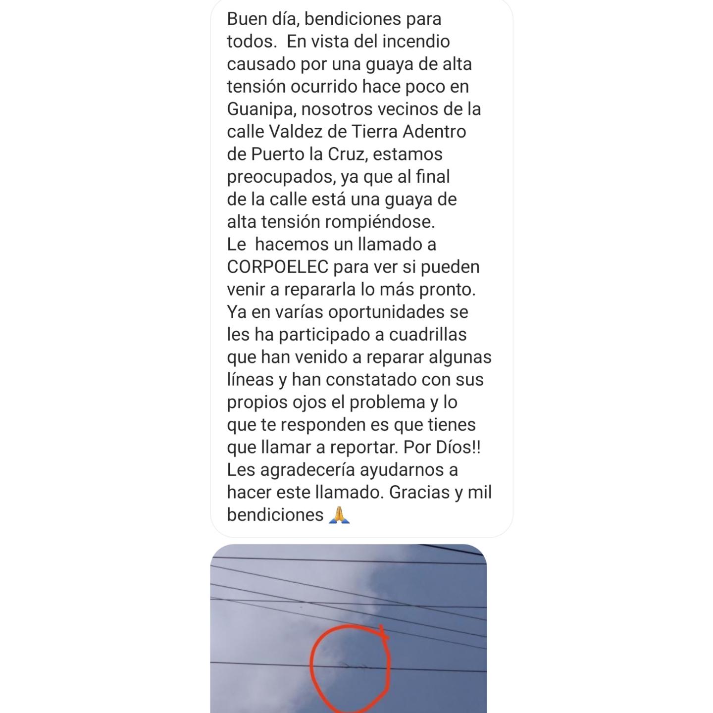 «Le hacemos un llamado a CORPOELEC para ver si pueden venir a repararla lo más pronto. Ya en varías oportunidades se les ha participado a cuadrillas que han venido a reparar algunas líneas y han constatado con sus propios ojos el problema y lo que te responden es que tienes que llamar a reportar. Por Díos!! Les agradecería ayudarnos a hacer este llamado. Gracias y mil bendiciones».