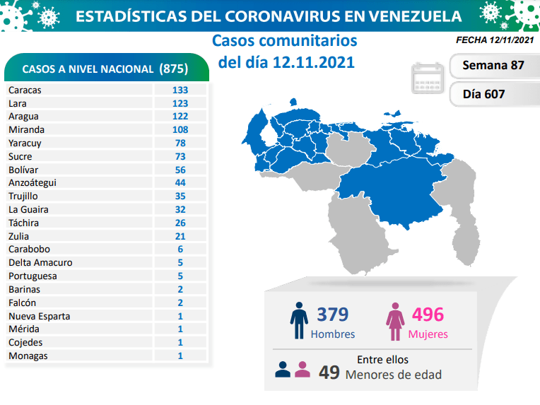 Informó Freddy Ñáñez, que los casos comunitarios de la jornada se detectaron en 21 entidades: Caracas (133), Lara (123), Aragua (122), Miranda (108), Yaracuy (78), Sucre (73), Bolívar (56), Anzoátegui (44), Trujillo (35), La Guaira (32), Táchira (26), Zulia (21), Carabobo (6), Delta Amacuro (5), Portuguesa (5), Barinas (2), Falcón (2), Nueva Esparta (1), Mérida (1), Cojedes (1) y Monagas (1).