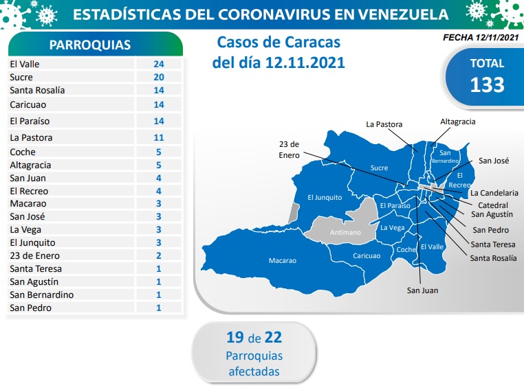 La entidad con mayor cantidad de contagios en la jornada es Caracas, con nuevos casos activos en 19 de sus 22 parroquias: El Valle (24), Sucre (20), Santa Rosalía (14), Caricuao (14), El Paraíso (14), La Pastora (11), Coche (5), Altagracia (5), San Juan (4), El Recreo (4), Macarao (3), San José (3), La Vega (3), El Junquito (3), 23 de Enero (2), Santa Teresa (1), San Agustín (1), San Bernardino (1) y San Pedro (1).