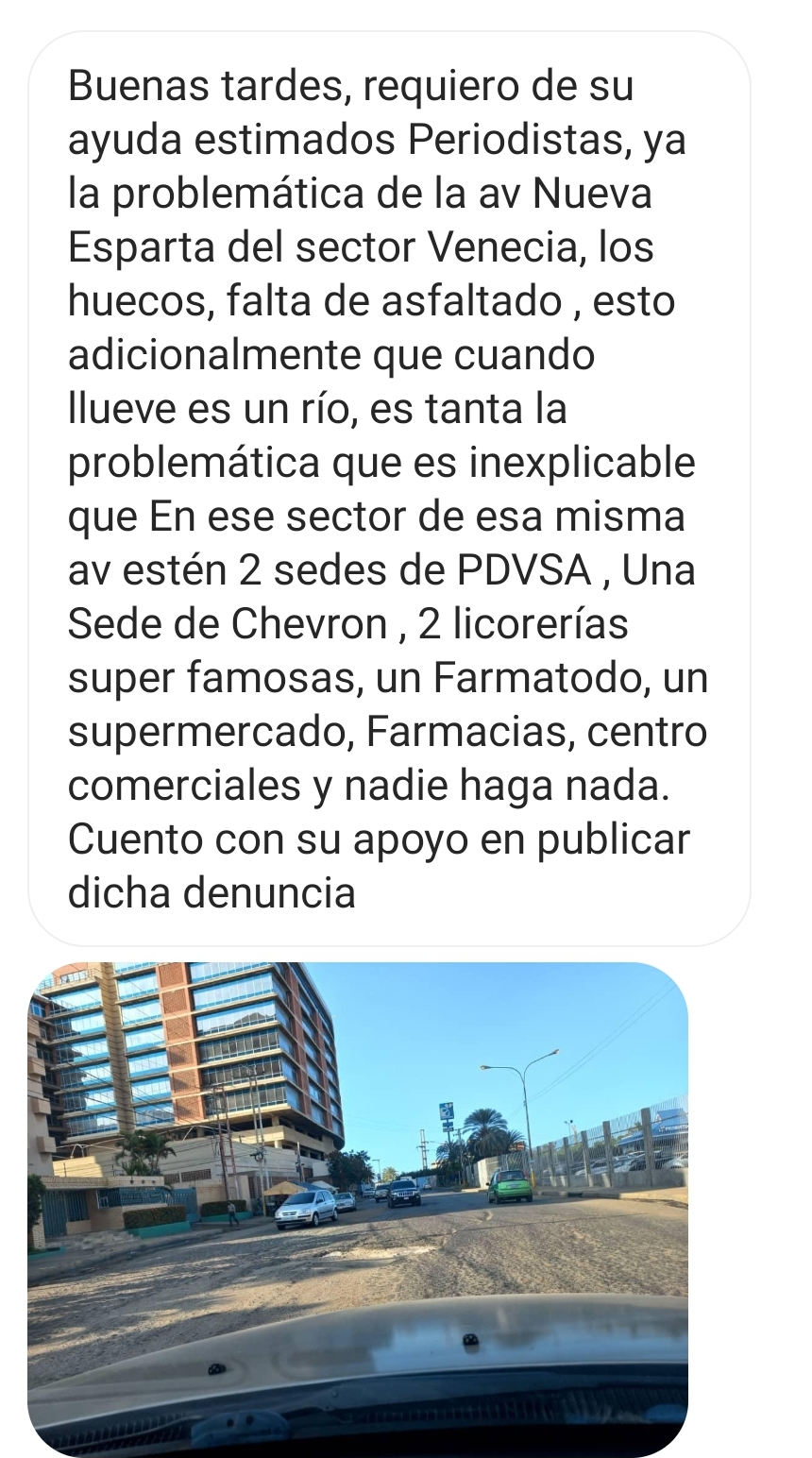 Refieren que «ya la problemática de la avenida Nueva Esparta del sector Venecia, los huecos, falta de asfaltado , esto adicionalmente que cuando llueve es un río, es tanta la problemática que es inexplicable que en ese sector de esa misma avenida estén 2 sedes de PDVSA , Una Sede de Chevron , 2 licorerías super famosas, un Farmatodo, un supermercado, Farmacias, centro comerciales y nadie haga nada».
