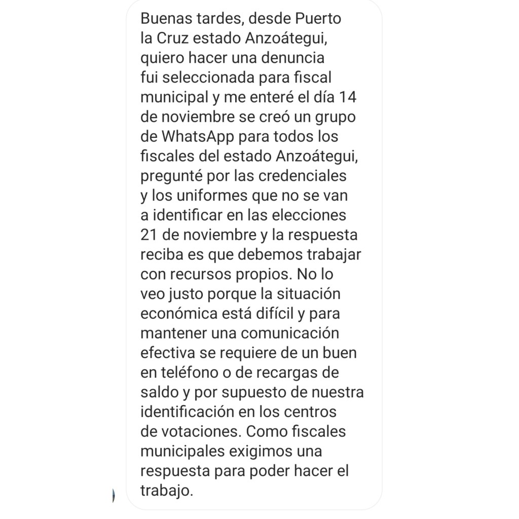 Refirió Heyllimar Cordero, que en su caso se enteró el día 14 de noviembre, se creó un grupo de WhatsApp para todos los fiscales del estado Anzoátegui, «pregunté por las credenciales y los uniformes, no se van a identificar en las elecciones 21 de noviembre y la respuesta recibida es que debemos trabajar con recursos propios».