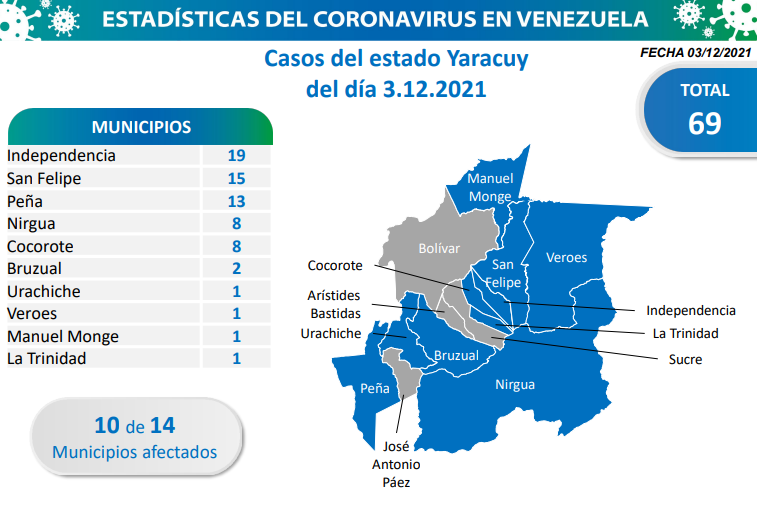 La entidad con mayor cantidad de contagios en la jornada es Yaracuy, en 10 de sus 14 municipios: Independencia (19), San Felipe (15), Peña (13), Nirgua (8), Cocorote (8), Bruzual (2), Urachiche (1), Veroes (1), Manuel Monge (1), La Trinidad (1).