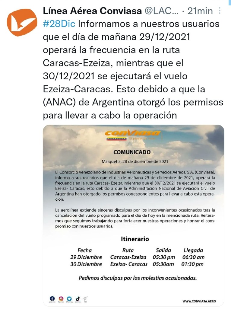 A las 7:33 pm de este martes, la Aerolínea emitió un #COMUNICADO a través de su cuenta de Twitter en donde ofrecía disculpas e informaba que el miércoles 29 de diciembre harían la ruta Caracas-Ezeiza, con salida a las 5:30 pm y el jueves 30 de diciembre volarían desde Ezeiza (Argentina) hasta Maiquetia a las 5:30 am.