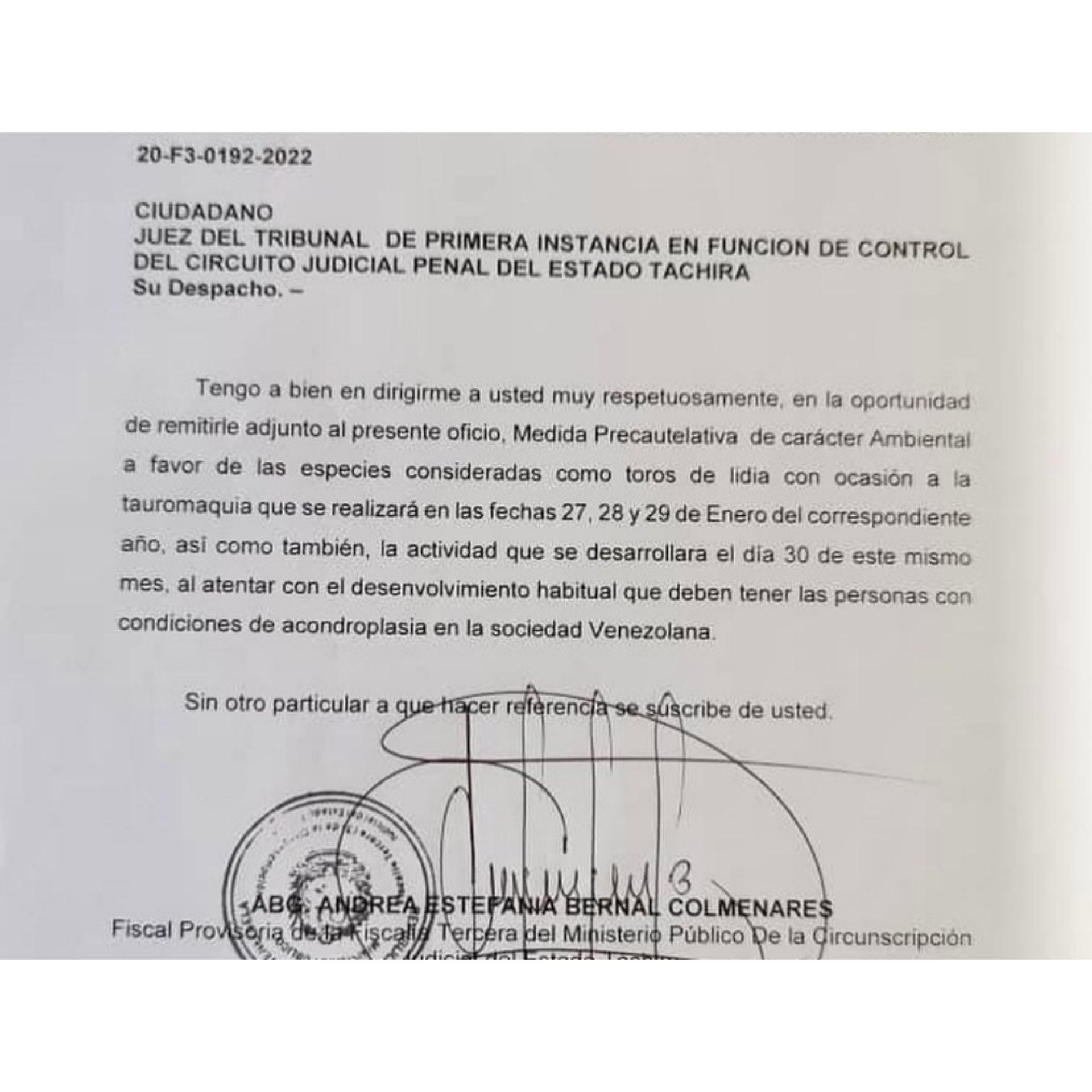 Este jueves en la noche el @mp.venezolano informó que basados en la #Constitución solicita en #Táchira MEDIDA PRECAUTELATIVA a favor de las especies conocidas como toros de lidia y en pro de las personas con alguna #discapacidad (ACONDROPLASIA) usadas al estilo de los “circos romanos” para el escarnio público.