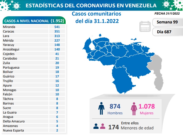 Informó que los casos comunitarios de la jornada se detectaron en 24 entidades del país: Miranda 541, Caracas 351, Lara 313, Mérida 227, Yaracuy 148, Anzoátegui 140, Cojedes 41, Carabobo 21, Zulia 20, Portuguesa 19, Bolívar 18, Guárico 17, Trujillo 16, Apure 12, Monagas 10, Falcón 10, Táchira 8, Barinas 8, Sucre 8, La Guaira 7, Aragua 6, Delta Amacuro 5, Amazonas 4, Nueva Esparta 2.