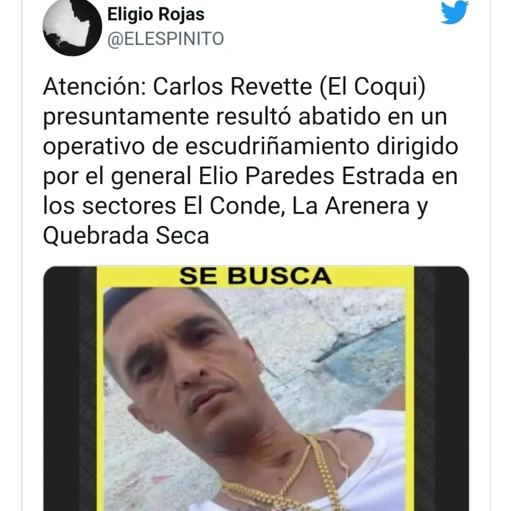 El delincuente Carlos Revette (El Coqui) fue abatido este martes por cuerpos de seguridad en la continuación de un operativo efectuado por las autoridades en Las Tejerías, estado Aragua.