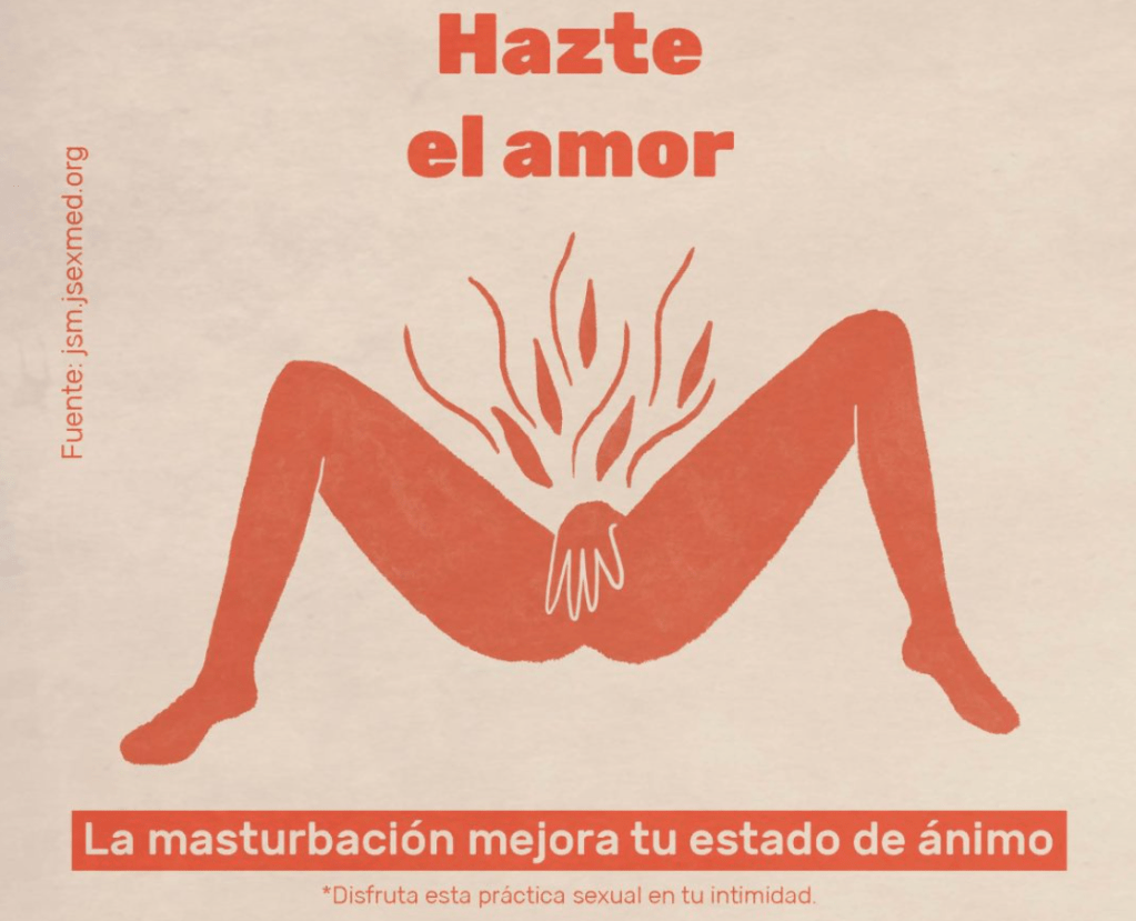 La ilustración muestra la silueta de una mujer brindándose autoplacer y va acompañada del mensaje “Para el mal humor, hazte el amor”.