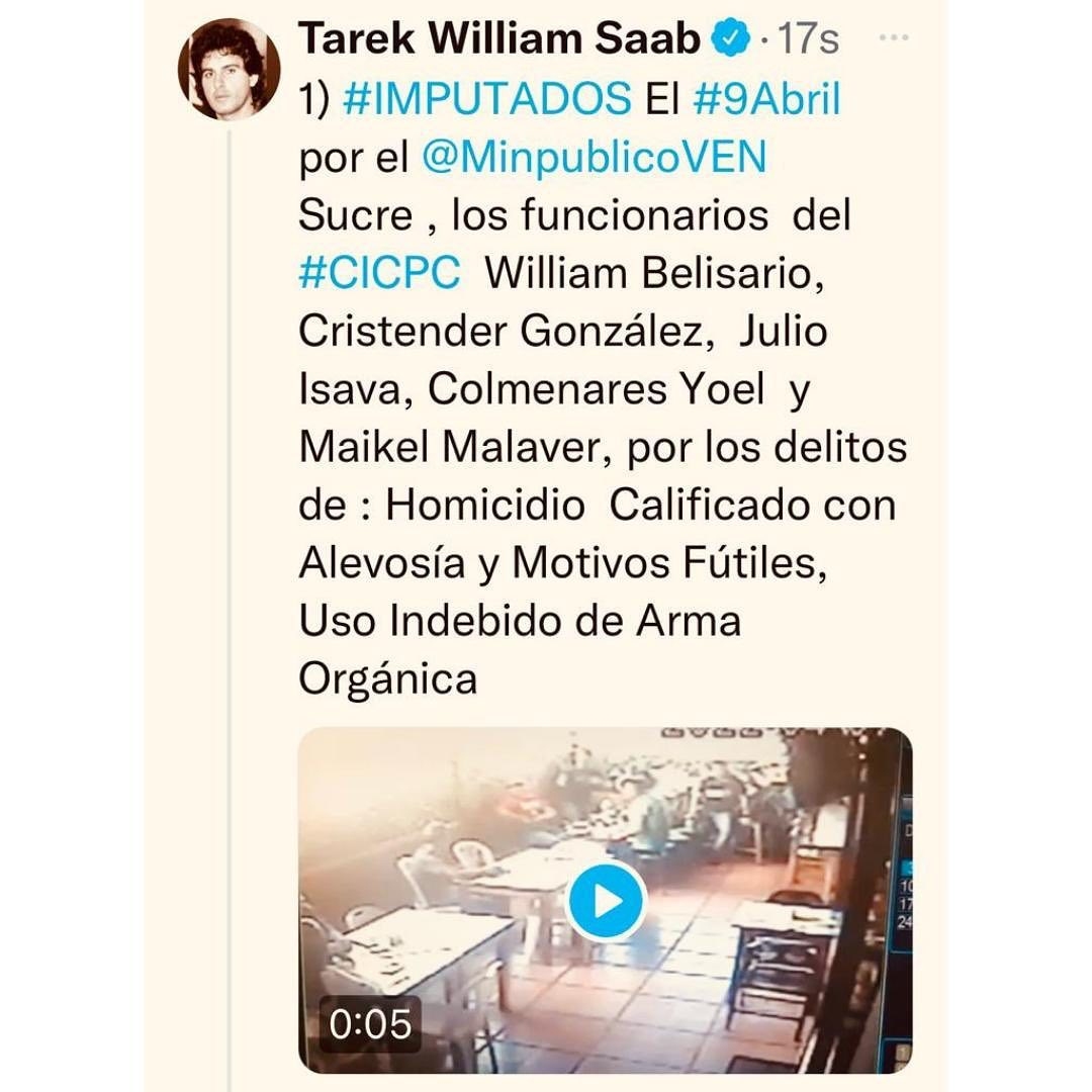 Este domingo el Fiscal General @tarekwilliamsaabh informó que fueron imputados por el @mpublicove en el estado Sucre, los funcionarios del #CICPC William Belisario, Cristender González, Julio Isava, Colmenares Yoel y Maikel Malaver, por los delitos de homicidio Calificado con Alevosía y Motivos Fútiles, Uso Indebido de Arma Orgánica, así como simulación de Hecho Punible.