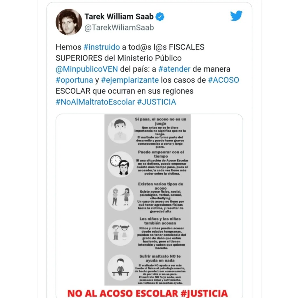 El fiscal General de la República, Tarek William Saab, urgió a los fiscales superiores del Ministerio Público dar prioridad al acoso escolar. Así lo comunicó a través de Twitter. Además, indicó que en el caso de presentarse un caso de este tipo debe hacerse la denuncia ante las instancias correspondientes.