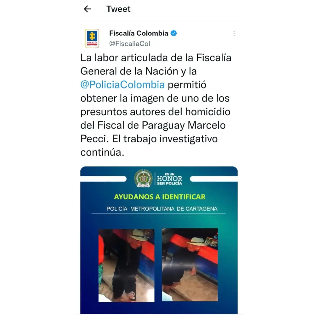 La Fiscalía colombiana escribió en Twitter: La labor articulada de la Fiscalía General de la Nación y la @PoliciaColombia permitió obtener la imagen de uno de los presuntos autores del homicidio del Fiscal de Paraguay Marcelo Pecci. El trabajo investigativo continúa.