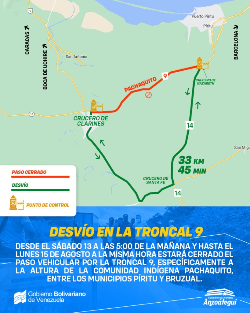Este miércoles 10 de agosto, el gobernador del estado Anzoátegui, Luis Marcano, anunció que a partir de este sábado 13 de agosto a las 5:00 de la mañana cerrarán el paso por la carretera nacional Troncal 9, específicamente a la altura de la comunidad indígena Pachaquito, entre los municipios Bruzual y Píritu.