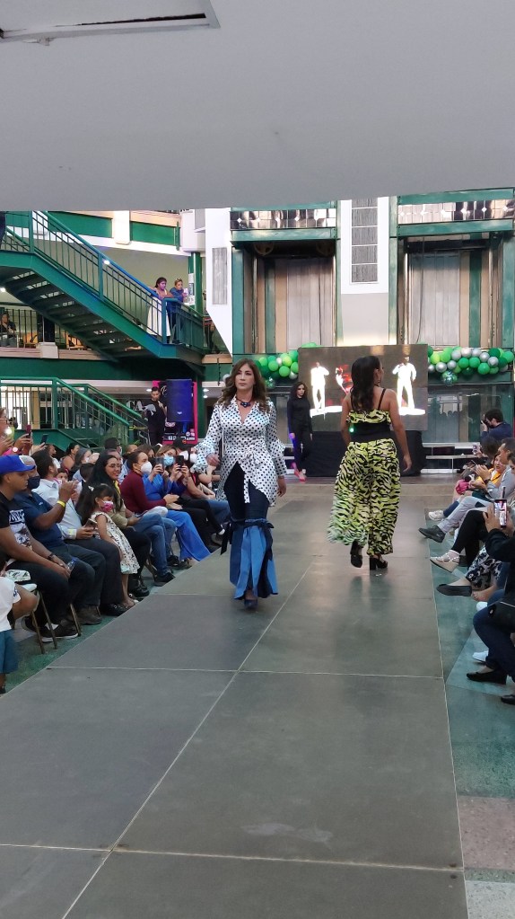 Farinhas definió su trabajo como “moda inclusiva” y una muestra de ello fue que en la apertura del desfile, la primera aparición fue de la modelo con discapacidad María Alcántara, quien lució un vestido con formas geométricas.