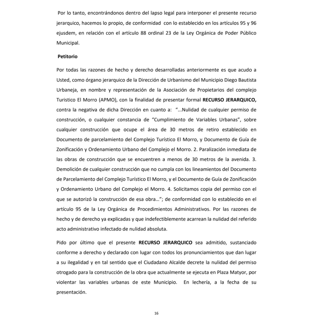 Para solicitar la nulidad del permiso otorgado para la construcción de una obra en la parcela del Centro Comercial Plaza Mayor, la Asociación de Propietarios del Complejo Turístico El Morro (APMO) presentó ante el despacho del alcalde de Diego Bautista Urbaneja un Recurso Jerárquico contra la negativa de la Dirección de Urbanismo del municipio, de responder este petitorio.
