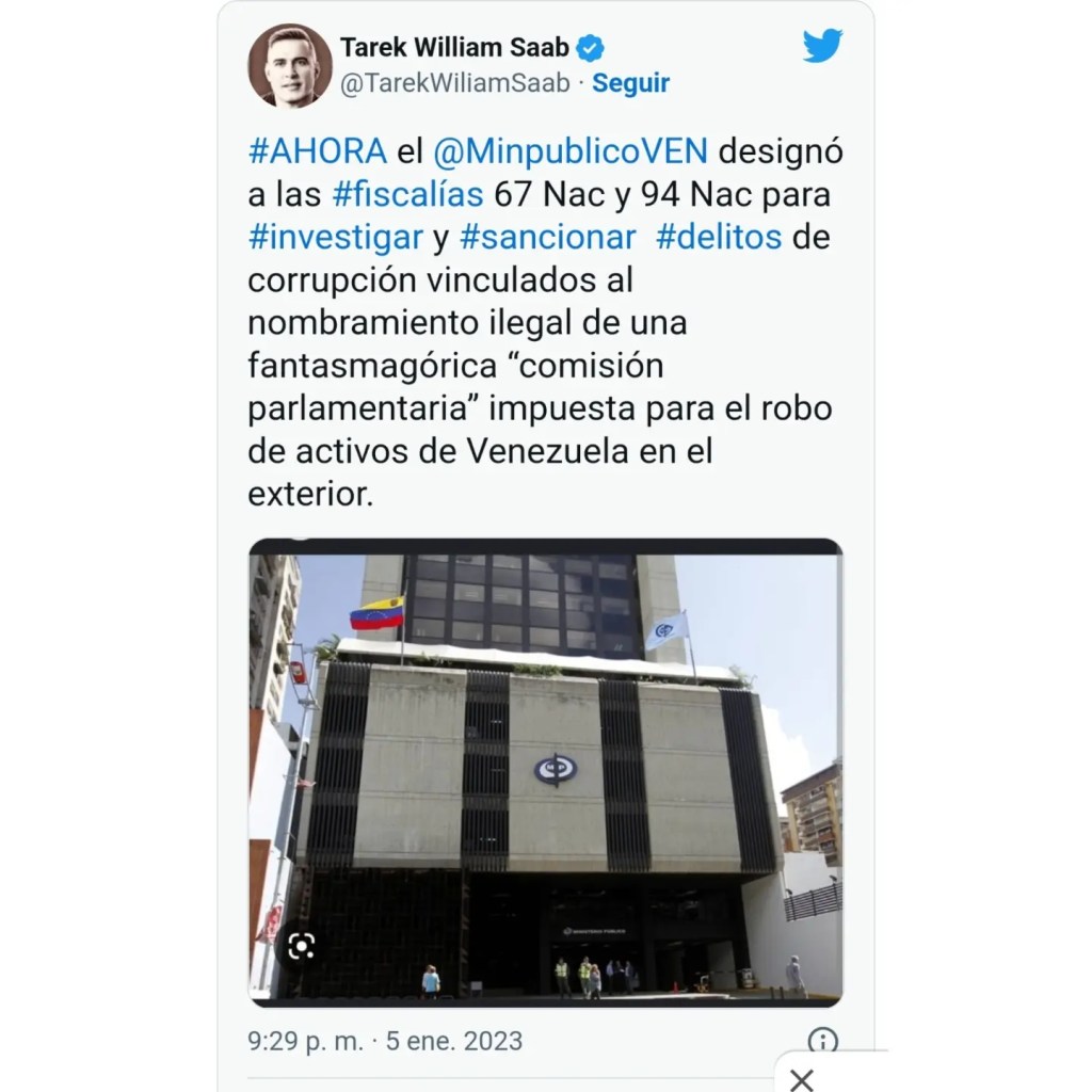 El Ministerio Público designó a las fiscalías 67 Nacional y 94 Nacional para investigar y sancionar delitos de corrupción vinculados al nombramiento ilegal de una fantasmagórica ‘comisión parlamentaria’ impuesta para el robo de activos de Venezuela en el exterior», dijo el fiscal en su cuenta en la red social Twitter.