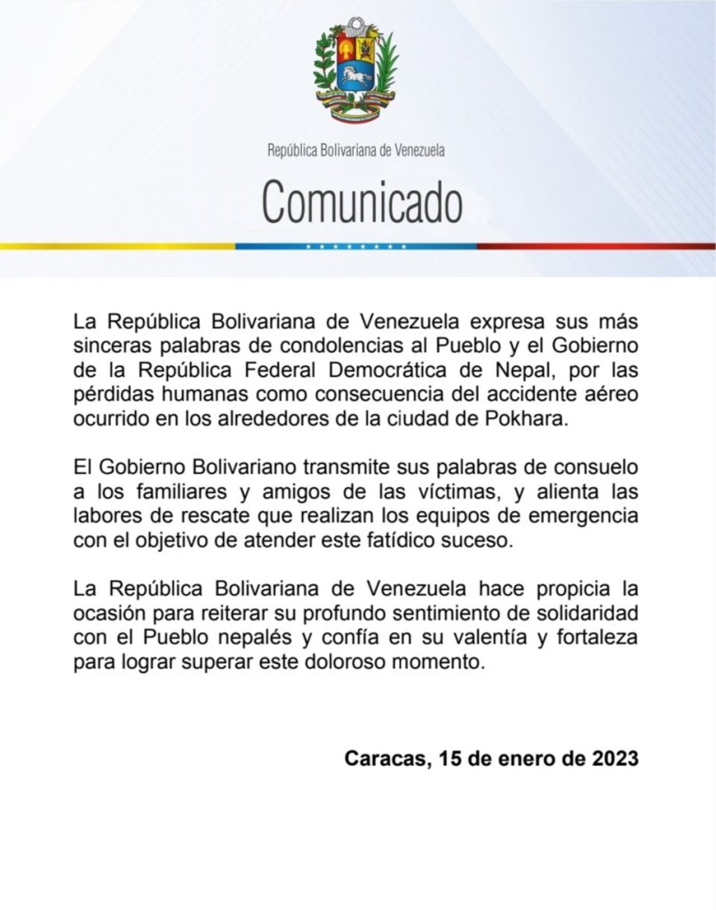 «La República Bolivariana de Venezuela expresa sus más sinceras palabras de condolencias al pueblo y el Gobierno de la República Federal Democrática de Nepal, por las pérdidas humanas como consecuencia del accidente aéreo ocurrido en los alrededores de la ciudad de Pokhara»