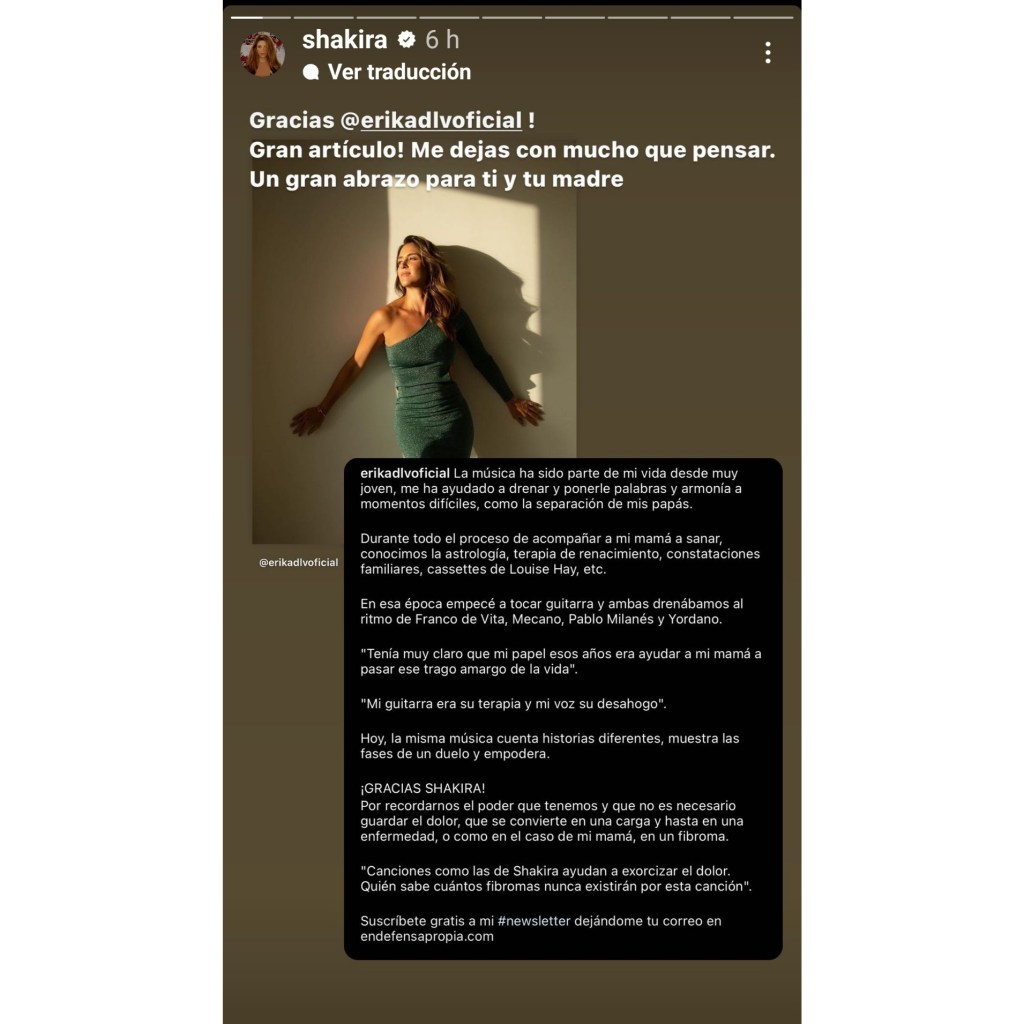 Por su parte la cantante colombiana reposteó a través de sus stories de Instagram el relato de Erika.