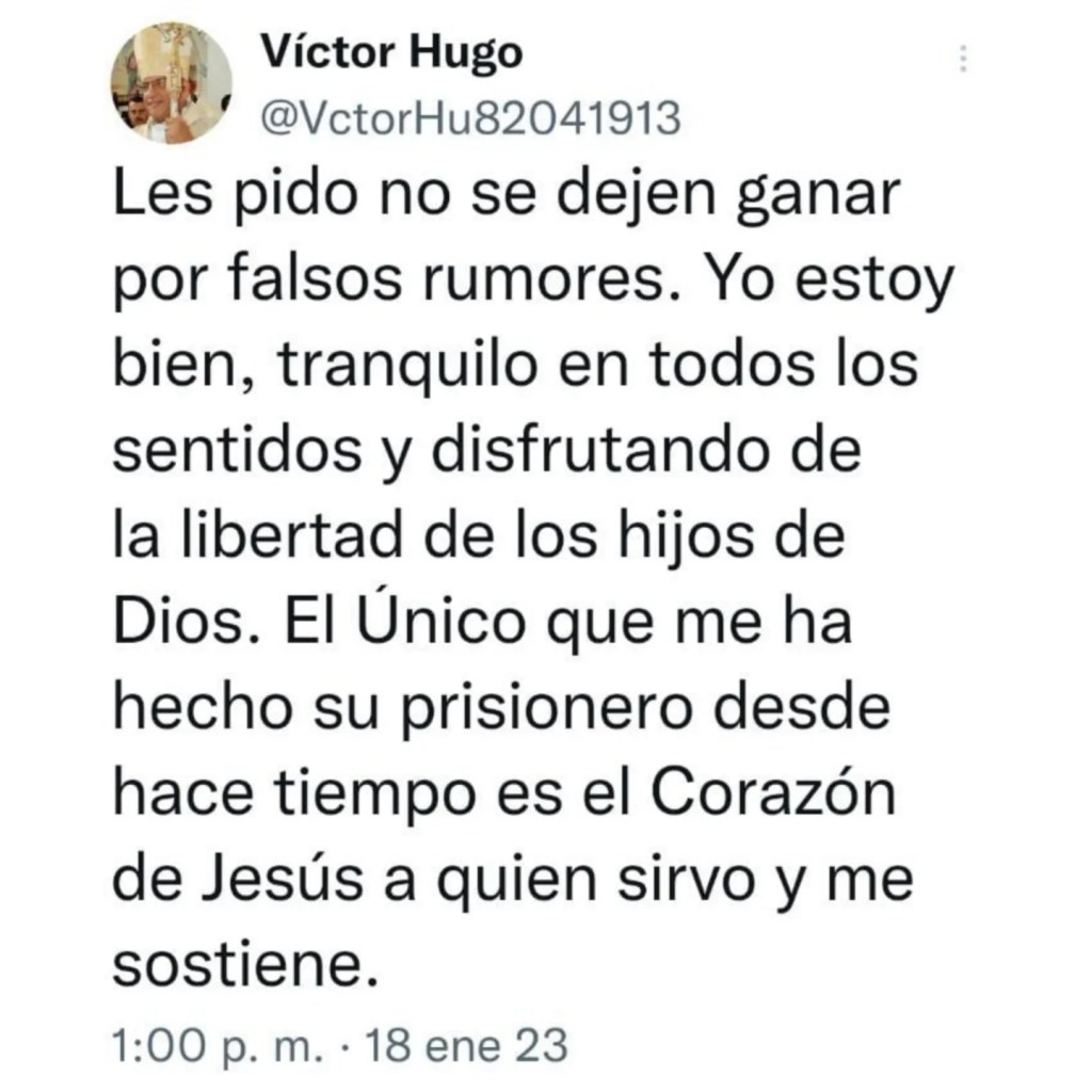 El obispo venezolano Víctor Hugo #Basabe publicó este miércoles #18enero un mensaje en su cuenta de Twitter, ante rumores de que había sido detenido, «Les pido no se dejen ganar por falsos rumores. Yo estoy bien, tranquilo en todos los sentidos y disfrutando de la libertad de los hijos de Dios. El Único que me ha hecho su prisionero desde hace tiempo es el Corazón de Jesús a quien sirvo y me sostiene.»