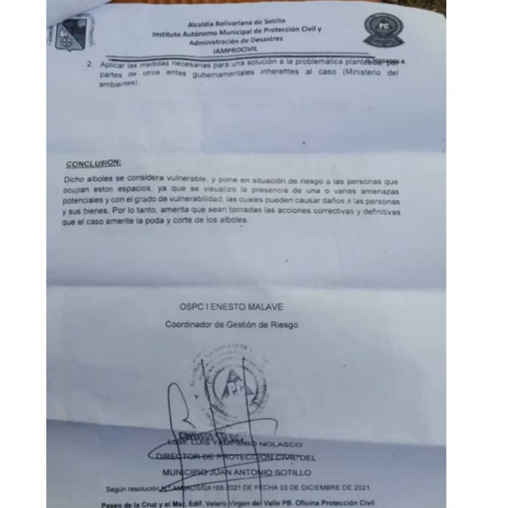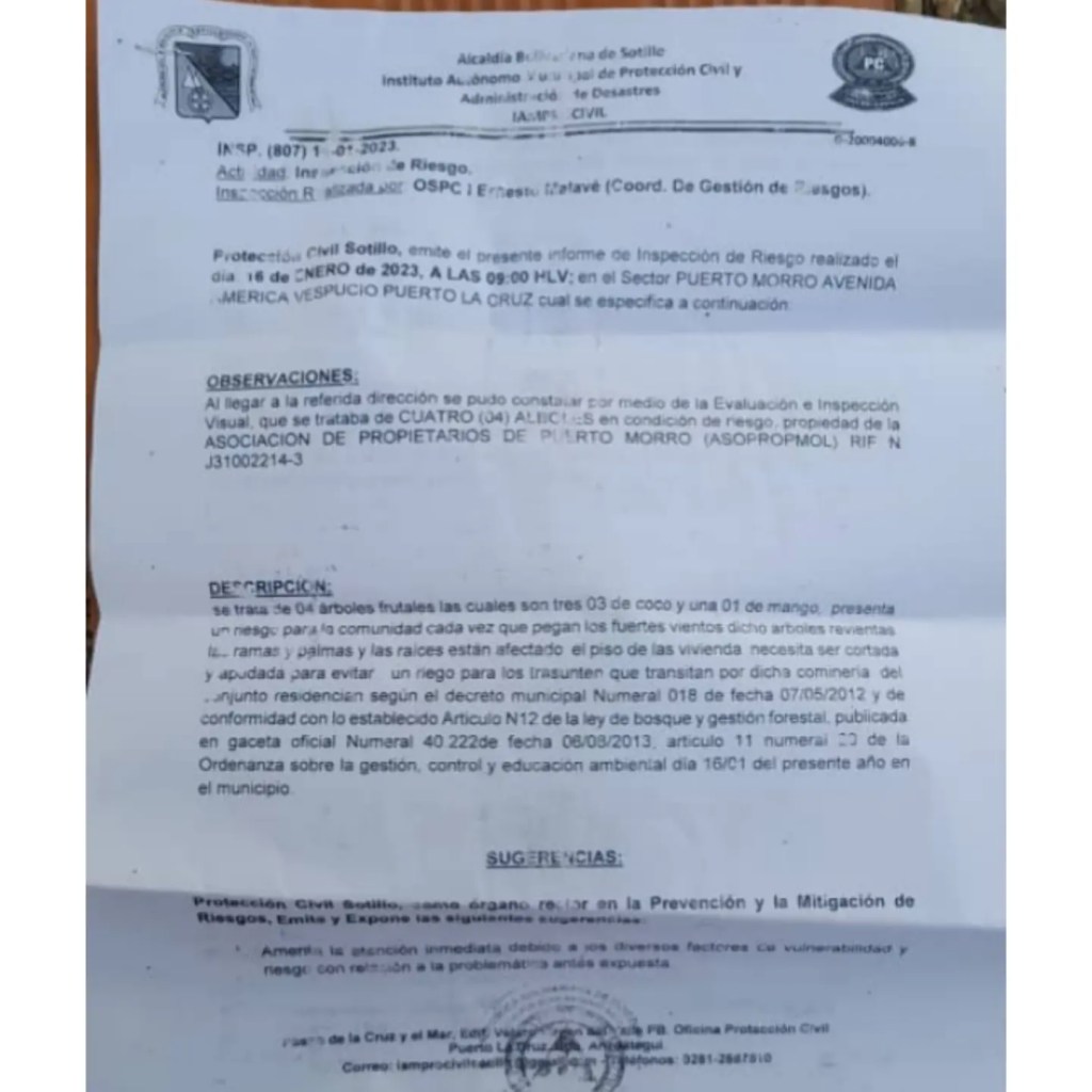 Sin embargo desde la junta de condominio refieren que la poda está autorizada por la oficina municipal de Protección Civil en Sotillo, quienes el pasado 16 de enero después de efectuar una evaluación concluyeron que los cuatro árboles, uno de mango y tres de coco, estaban poniendo en riesgo bienes y personas de la referida urbanización