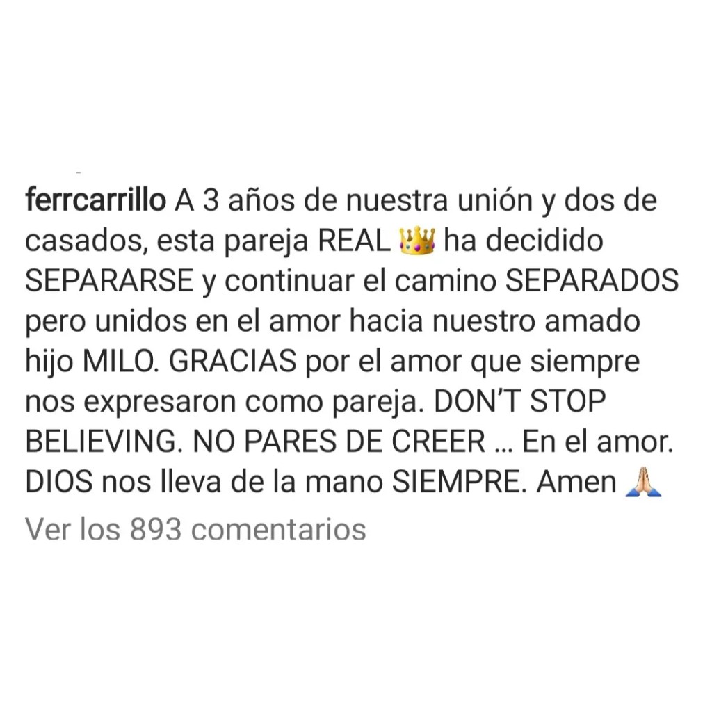 «A tres años de nuestra unión y dos de casados, esta pareja real ha decidido separarse y continuar el camino separados, pero unidos en el amor hacia nuestro amado hijo, Milo», expresó Fernando Carrillo en la red social, al mostrar un video junto a Rodríguez.