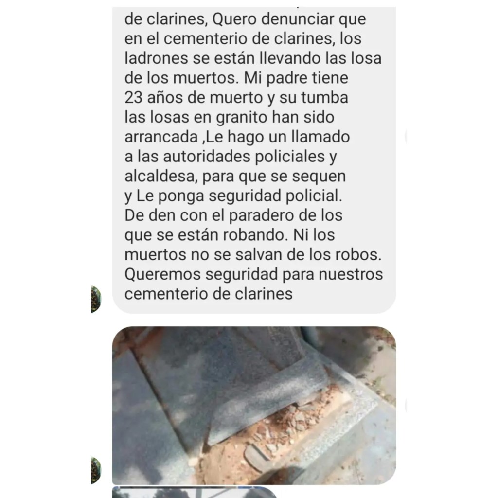 «Ni los muertos no se salvan de los robos. Queremos seguridad para nuestros cementerio de Clarines», dijo la denunciante.