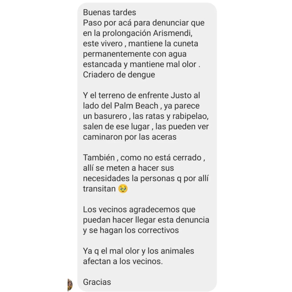 «Los vecinos agradecemos que puedan hacer llegar esta denuncia y se hagan los correctivos, ya que el mal olor y los animales afectan a los vecinos».