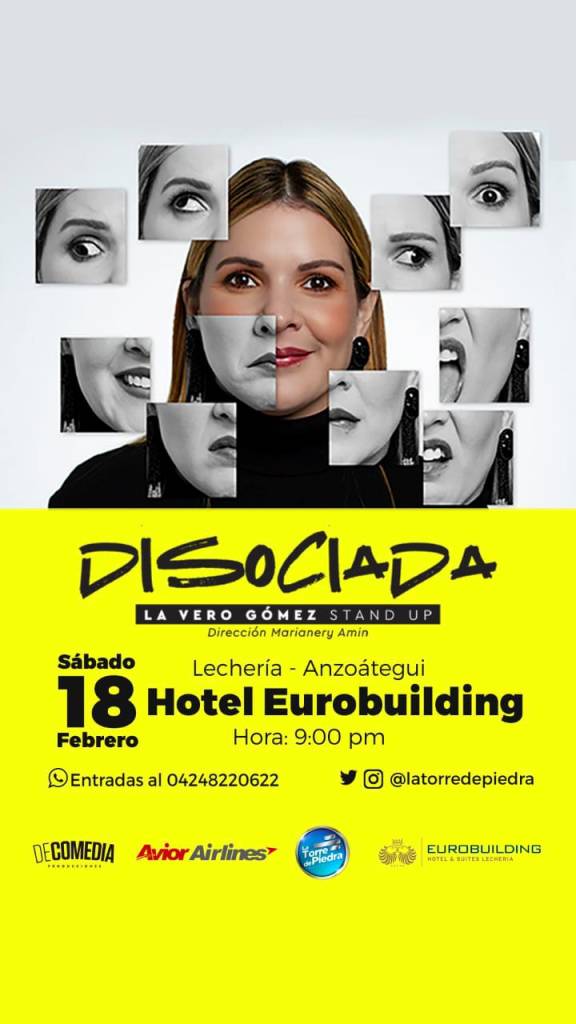La locutora y comediante La Vero Gómez luego del éxito obtenido en varias ciudades del mundo con su stand-up “Disociada”, llega a la Lechería, estado Anzoátegui de la mano de La Torre de Piedra, productora con amplia trayectoria en la zona. para hacer pasar un rato cargado de buena vibra a los asistentes.