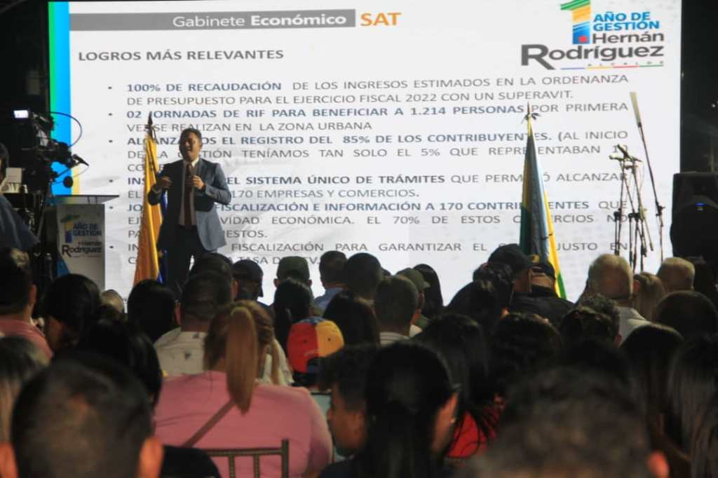 Durante el evento se pudo mostrar, describir y enumerar una serie de obras y cifras de las fortalezas de su primer año de Gobierno, correspondientes al 2022, las cuales cuenta y marcan una positiva gestión, resaltando entre los logros más relevantes en materia económica 100 % recaudación Fiscal, instalación del Sistema Único de Trámites para alcanzar el registro de 170 empresas y comercios.