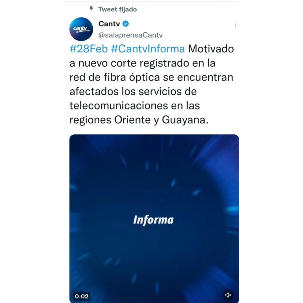 La empresa del estado venezolano informó hace dos días a través de su Twitter que con el nuevo corte de fibra se veían afectados los estados Bolívar y Anzoátegui.