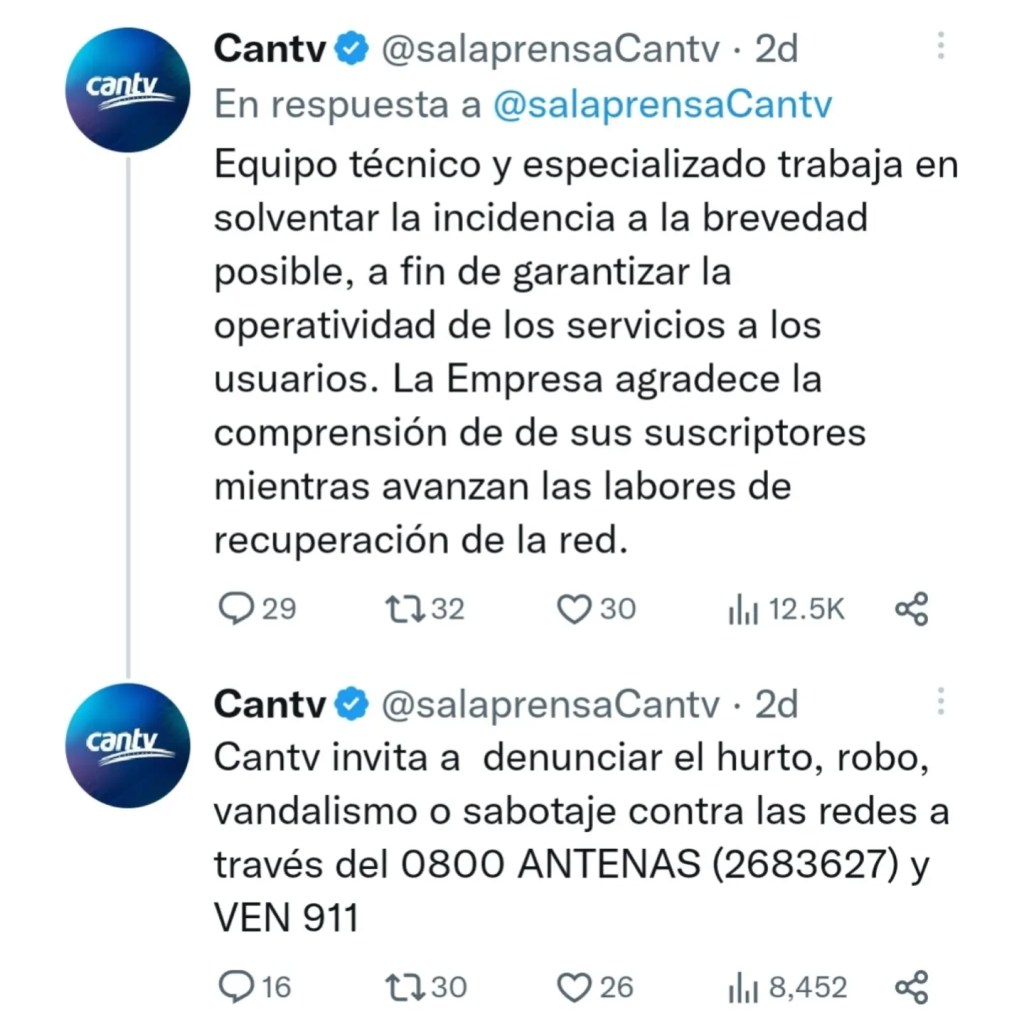 La empresa Cantv también invitó a denunciar el robo, hurto o vandalismo hacia los equipos de comunicación que dejan incomunicada a la población.
