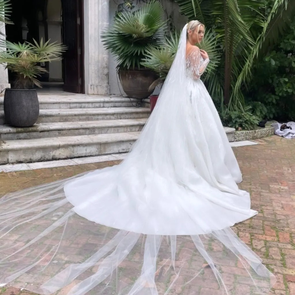 Para su gran día, la influencer ha lucido tres vestidos distintos. Para el ceremonia se ha decantado por un vestido con escote semitransparente decorado con brillantes, ceñido en la parte del busto y una falda vaporosa de la firma Zuhair Murad.
