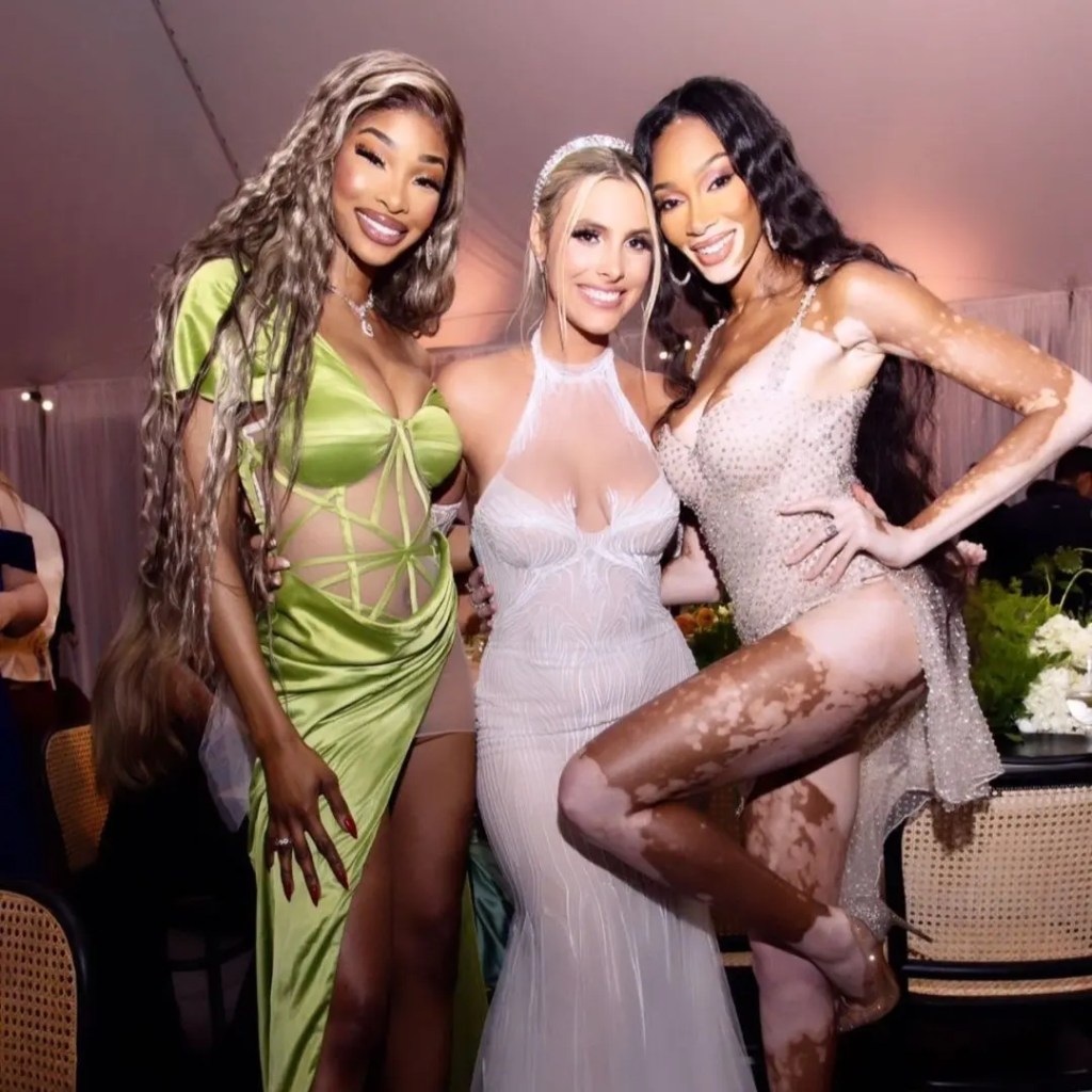 Otro de los momentos inmortalizados en la red social fue la foto que compartió con su dama de honor Paris Hilton. La famosa socialité lució un vestido de manga larga, completamente transparente en tono café claro y cubierto de pedrería fina.