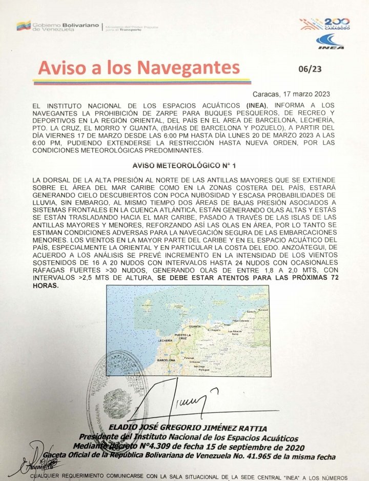zarpe de los buques pesqueros, de recreo y deportivos en la región oriental, específicamente en Barcelona, Lechería, Puerto la Cruz, El Morro y Guanta a partir de este viernes hasta el lunes 20 de marzo a las 6:00pm.