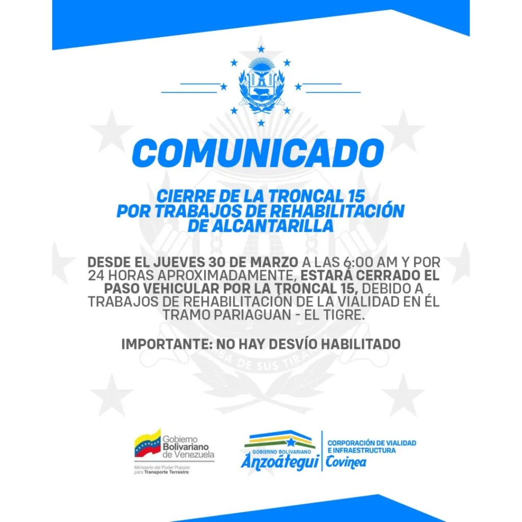 A través de un comunicado, el Ministerio de Transporte Terrestre, informó que la Troncal 15 en el tramo de Pariaguán y El Tigre (Anzoátegui), estará cerrado a partir de las 6:00 am de este jueves 30 de marzo.
