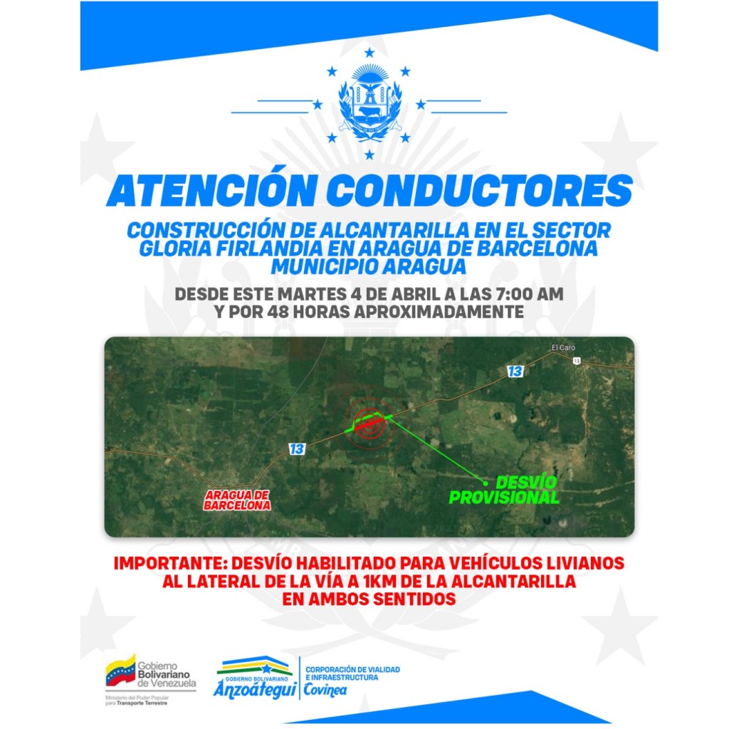 Este martes 04 de abril a las 7:00 de la mañana y por un lapso aproximado de 48 horas, quedará cerrado el paso vehicular por la carretera nacional Troncal 13, específicamente en el sector Gloria Firlandia de Aragua de Barcelona, en el municipio Aragua, debido a la reconstrucción de una alcantarilla colapsada.