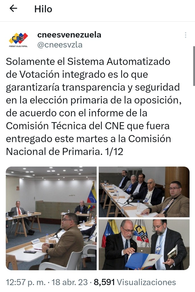 «En Soy Venezuela tenemos información extraoficial que indica que el CNE se habría dirigido a la Comisión Nacional de Primaria (CNP) sometiendo la entrega de copia de la versión depurada del Registro Electoral Permanente (REP), así como autorización para el uso de los centros electorales -que no son otros que escuelas y colegios públicos y privados-, a la aceptación por parte de la CNP de que las primarias se lleven a cabo con uso de las captahuellas y voto electrónico, es decir con sus máquinas», indicó Soy Venezuela.