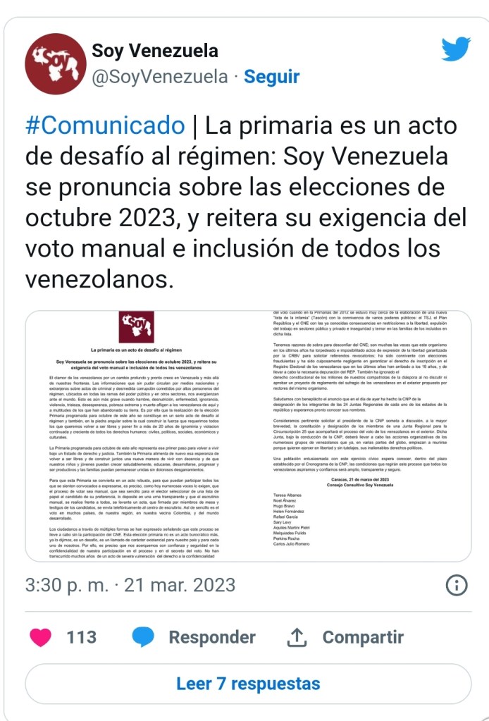 Además, indicó: «La sociedad venezolana, como lo expresó el presidente de la CNP el 15 de febrero en importante acto de anuncio del cronograma, se ha ido apropiando de la primaria. Pero, una primaria así, bajo las condiciones del CNE, no será ni libre ni robusta como la quieren las grandes mayorías populares. Y tampoco será como lo prometió la Comisión Nacional de Primaria: amplia, transparente y segura».