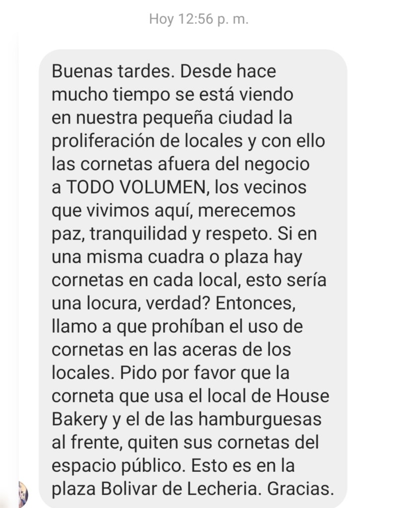 En la mensajería directa la señora expone: Desde hace mucho tiempo se está viendo en nuestra pequeña ciudad la proliferación de locales y con ello las cornetas afuera del negocio a TODO VOLUMEN, los vecinos que vivimos aquí, merecemos paz, tranquilidad y respeto. Si en una misma cuadra o plaza hay cornetas en cada local, esto sería una locura, verdad? Entonces, llamo a que prohíban el uso de cornetas en las aceras de los locales».