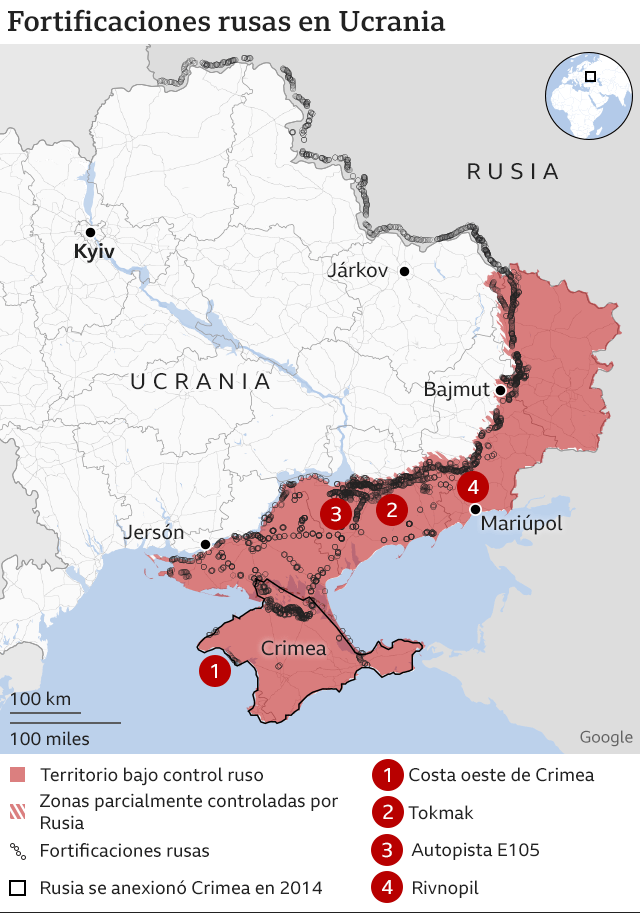 Pero algunos analistas señalan que las fuerzas ucranianas pueden utilizar imágenes por satélite similares y la vigilancia de drones para identificar y eludir muchas de estas defensas.